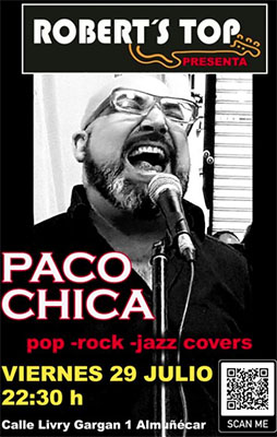ALMUNECAR – In bar/restaurant Robert’s Top in Almuñécar staat vrijdagavond 28 juli een optreden geprogrammeerd van de zanger Paco Chica. Het optreden begint rond 22.30 uur.