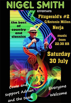 Nigel Smith bij Fitzgerald’s Bar II NERJA – De Britse zanger Nigel Smith treedt zaterdag 30 juli op bij Fitzgerald’s Bar II, aan de Calle Antonio Millón in het centrum van Nerja. Het optreden begint rond 22.30 uur en is gratis toegankelijk. Delen: Klik om te delen op X (Opent in een nieuw venster) X Klik om te delen op Facebook (Opent in een nieuw venster) Facebook Vind-ik-leuk Aan het laden...
