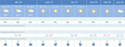 NERJA – Dit weekeinde en de komende week komt er weinig verandering in het weerbeeld rond Nerja ten opzichte van de afgelopen week. De meteorologen van het weerstation Aemet (Agencia Estatal de Meteorología) verwachten opnieuw veel zon en gemiddelde dagtemperaturen van circa 30 graden Celsius rond Nerja.