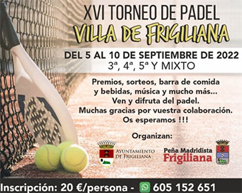 De inschrijfkosten bedragen twintig euro per persoon, inschrijven kan via whatsapp op het nummer +34 605 152 651. Padel kent in Andalusië een enorme populariteit en is het best te omschrijven als een combinatie tussen tennis en squash, waarbij de wedstrijden in koppels worden gespeeld. Het Torneo de pádel Villa de Frigiliana is georganiseerd door de gemeente Frigiliana.