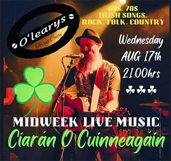 TORROX – De Ierse zanger en gitarist Cíarán Ó´Cuínneagáin verzorgt woensdagavond 17 augustus een akoestisch optreden in de kustplaats Torrox, op circa tien kilometer van Nerja gelegen. Dit gebeurt in O’Leary’s Irish Bar aan de Paseo Maritímo de Ferrara.