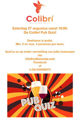 TORRE DEL MAR – Bij de Nederlandse bar Colibrí in de kustplaats Torre del Mar wordt zaterdag 27 augustus een zogeheten pubquiz gehouden. Deze begint om 16.00 uur, vooraf aanmelden per team is noodzakelijk.