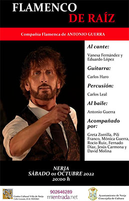NERJA – De (Flamenco) compañía de Antonio Guerra verzorgt zaterdagavond 1 oktober een optreden in het Centro Cultural Villa de Nerja aan de Calle Granada 45 in de binnenstad van de kustplaats. De show begint rond 20.00 uur en duurt ruim een uur.