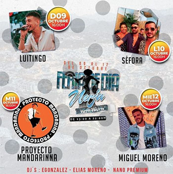 NERJA – Gedurende het jaarlijkse Feria de Nerja (dit jaar van zaterdag 8 tot en met woensdag 12 oktober) zijn er dagelijks optredens van artiesten en bands op het uitgaansplein Tutti Frutti van Nerja. Deze beginnen telkens om 16.00 uur, de toegang is vrij.