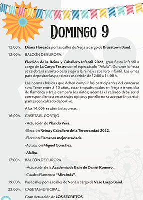 In de reeks aan omlijstende activiteiten rond het jaarlijkse Feria de Nerja treedt om 17.00 uur de dansgroep Daniel Romero op, samen met de flamencogroep Mirabrás. Ook dit gebeurt op het Balcón de Europa. Vanaf 19.00 uur trekt de Vaso Largo Band door de straten van het centrum van Nerja, om 23.00 uur treedt de formatie Los Secretos op in de Caseta Municipal op het Plaza d´España.