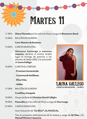 In de Caseta Municipal op het kermisterrein staat vanaf 14.00 uur een optreden gepland van de zangeres Laura Gallego, om 17.00 uur geeft het duo Costillita y Amapola een kinderoptreden op het Balcón de Europa. Om 18.00 uur staat op het Balcón de Europa een show geprogrammeerd welke wordt verzorgd door de dansgroep Christian David Callejón. Op hetzelfde tijdstip vertrekt het Vaso Largo-orkest voor een rondtocht door de straten van het centrum. De dinsdag wordt afgesloten met een opvoering van de musical El Selu in de gemeentelijke feesttent op het Plaza d´España (aanvang 23.00 uur).