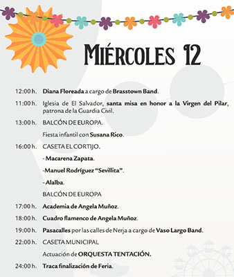 Vanaf 16.00 uur staan er diverse optredens gepland in de Caseta El Cortijo op het kermisterrein, waarbij onder anderen Macarena Zapata, Manuel Rodríguez ´Sevillita´ en de groep Alalba hun opwachting maken. Op het Balcón de Europa treden om zowel 17.00 als 18.00 dansgroepen van Angela Muñoz op. Het Orquesta Tentación sluit van 23.00 uur de reeks aan optredens in de Caseta Municipal op de Plaza d´España af.