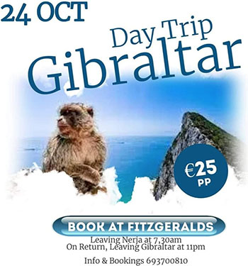 NERJA – Vanaf Fitzgerald´s Bar in Nerja is het maandag 24 oktober mogelijk een dagtrip per bus te maken vanuit Nerja naar Gibraltar. De tocht kost 25 euro per persoon, met als opstapplaats Fitzgerald´s Bar aan het Parque Verano Azul bij de entree van Nerja.