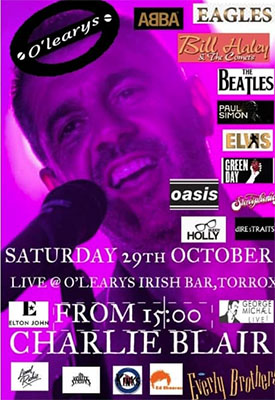 TORROX – De Britse zanger Charlie Blair treedt zaterdagmiddag 29 oktober op in de kustplaats Torrox, op circa tien kilometer van Nerja gelegen. Blair is dan te beluisteren bij O’Leary’s Irish Bar aan de Paseo Marítimo de Ferrara.