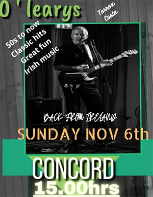 TORROX – In Torrox-Costa treedt zondagmiddag 6 november de Ierse zanger en gitarist Concord op. Dit gebeurt in O’Leary’s Irish Bar aan de Paseo Maritímo de Ferrara.