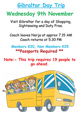 NERJA – De Club Internacional Nerja, een sociale en culturele organisatie die zich onder meer bezig houdt met het organiseren van trips vanuit Nerja, heeft voor woensdag 9 november een dagtrip per bus uitgezet vanuit Nerja naar Gibraltar.