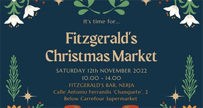 NERJA – Op het terrein van Fitzgerald´s Bar in Nerja, onder de Carrefour-supermarkt op de hoek van het Parque Verano Azul, wordt zaterdag 12 november een Christmas Market gehouden. Deze is te bezoeken van ´s-ochtends 10.00 tot ´s-middags 14.00 uur.