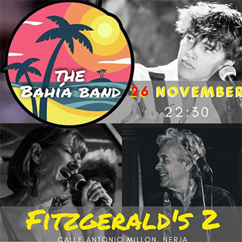 NERJA – The Bahía Band treedt zaterdagavond 26 november op bij Fitzgerald’s Bar II aan de Calle Antonio Millón 2 in het centrum van Nerja.