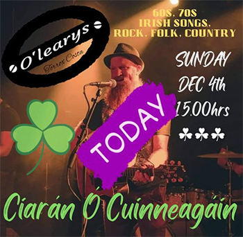 TORROX – De Ierse zanger en gitarist Cíarán Ó´Cuínneagáin verzorgt zondagmiddag 4 december een akoestisch optreden in de kustplaats Torrox, op circa tien kilometer van Nerja gelegen. Dit gebeurt in O’Leary’s Irish Bar aan de Paseo Maritímo de Ferrara.