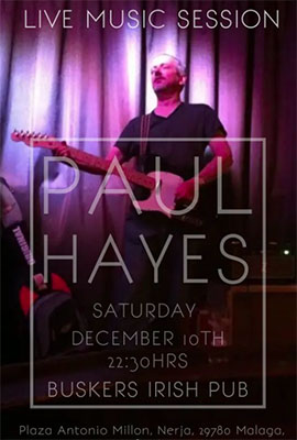 NERJA – De zanger/gitarist Paul Hayes speelt zaterdagavond 10 december bij Buskers Irish Pub in Nerja. De bar is te vinden aan de Calle Antonio Millon, het optreden begint rond de klok van 22.30 uur en is gratis toegankelijk.