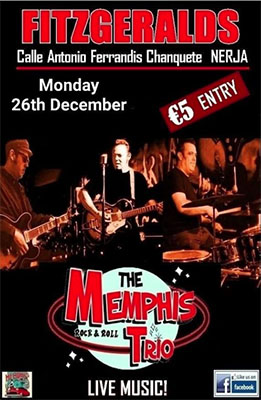 NERJA – Bij Fitzgerald’s Baar, op de hoek van park Verano Azul onder het pand van de Carrefour-supermarkt in Nerja , treedt maandagavond 26 december het Memphis Trio op. De formatie speelt voornamelijk rock and roll-muziek.