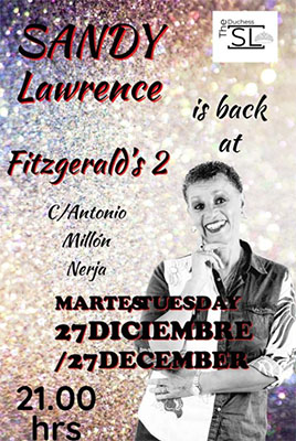 Zangeres Sandy Lawrence bij Fitzgerald’s Bar II NERJA – De zangeres Sandy Lawrence treedt dinsdag 27 december op bij Fitzgerald’s Bar II aan de Calle Antonio Millón in het centrum van Nerja. Het optreden begint rond de klok van 21.00 uur, de bar is geopend vanaf 19.00 uur. Delen: Klik om te delen op X (Opent in een nieuw venster) X Klik om te delen op Facebook (Opent in een nieuw venster) Facebook Vind-ik-leuk Aan het laden...