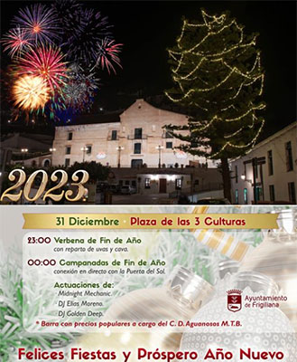 FRIGILIANA – In het dorp berg Frigiliana, even boven Nerja gelegen, wordt op zaterdag 31 december een oudejaarsfeest gevierd op het Plaza de las Tres Culturas. Dit begint om 23.00 uur, vanaf middernacht is het daarbij tijd voor het nuttigen van de traditionele twaalf druiven (één per maand voor voorspoed in het nieuwe jaar) en de gebruikelijke champagne.