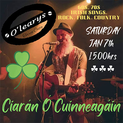 TORROX – De Ierse zanger en gitarist Cíarán Ó´Cuínneagáin verzorgt zaterdagmiddag 7 januari een akoestisch optreden in de kustplaats Torrox, op circa tien kilometer van Nerja gelegen. Dit gebeurt in O’Leary’s Irish Bar aan de Paseo Maritímo de Ferrara.