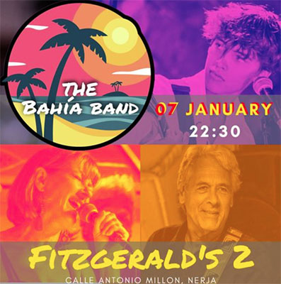 NERJA – The Bahía Band treedt zaterdagavond 7 januari op bij Fitzgerald’s Bar II aan de Calle Antonio Millón 2 in het centrum van Nerja.
