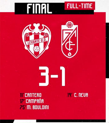 Levante liet weinig aan de verbeelding over en stond reeds na zeventien minuten op een 2-0 voorsprong na doelpunten van Alejandro Cantero (elfde minuut) en José Campaña (zeventiende minuut, strafschop). Granada sputterde nog wel even tegen en kwam in de twintigste minuut terug tot 2-1 via een treffer van Carlos Neva. Halverwege de tweede helft besliste Mohamed Bouldini het duel door de 3-1 binnen te werken.