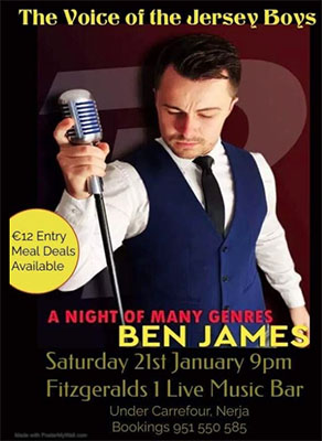 NERJA – Bij Fitzgerald´s Bar I, op de hoek van park Verano Azul (Calle Antonio Ferrandis Chanquete) onder het pand van de Carrefour-supermarkt in Nerja, treedt zaterdagavond 21 januari de zanger en gitarist Ben James op.