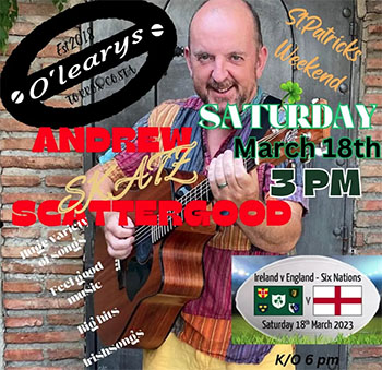 TORROX – Bij O’Leary’s Irish Bar aan de Paseo Maritímo de Ferrara in Torrox treedt zaterdagavond 18 maart de zanger/gitarist Andrew ´Skatz´ Scattergood op.
