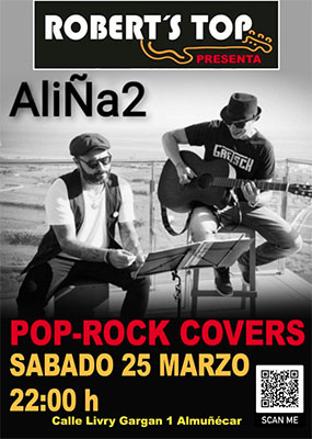 ALMUNECAR – In bar/restaurant Robert’s Top in de kustplaats Almuñécar staat zaterdagavond 25 maart een optreden geprogrammeerd van het Duo AliÑa 2. Het optreden begint rond 22.00 uur.
