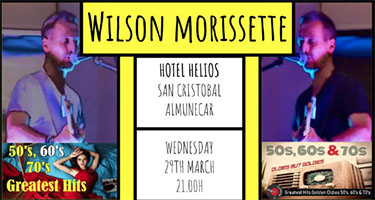 ALMUNECAR – In hotel Helios in de kustplaats Almuñécar staat woensdagavond 29 maart een optreden geprogrammeerd van de artiest Wilson Morisette. Het optreden begint rond 21.00 uur.