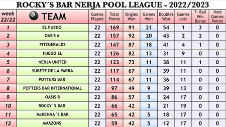 NERJA – Het poolteam van de Spaans/Nederlandse bar El Fuego heeft de Nerja Pool League 2022/2023 gewonnen. Het team, dat uit spelers van diverse nationaliteiten bestaat, prolongeerde de titel nadat het zich eerder ook al tot winnaar liet kronen in het seizoen 2019/2020. Het daaropvolgende jaar ging de competitie niet door vanwege de Corona-crisis.