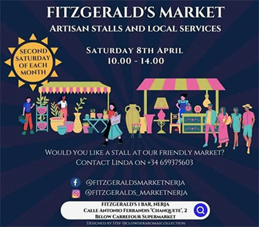 NERJA – Op het terras van Fitzgerald´s Bar naast het park Verano Azul (Calle Antonio Ferrandis Chanquete) wordt deze zaterdag 8 april een markt gehouden. Het betreft een maandelijkse markt met handgemaakte producten.