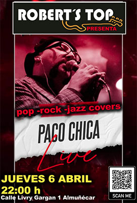 ALMUNECAR – In bar/restaurant Robert’s Top in Almuñécar staat donderdagavond 6 april een optreden geprogrammeerd van de zanger Paco Chica. Het optreden begint rond 22.00 uur.