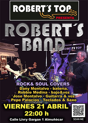 ALMUNECAR – In bar/restaurant Robert’s Top in Almuñécar staat vrijdagavond 21 april een optreden geprogrammeerd van Robert´s Band. Het optreden begint rond 22.00 uur.