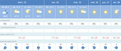 Naast de hoge voorjaarstemperaturen staat Nerja de komende dagen ook relatief veel zon te wachten. De wind blijft de komende week matig tot zwak, van neerslag is er in de voorspellingen helemaal geen sprake. Voor zondag 23 april worden door Aemet gemiddelde dagtemperaturen van circa 23 graden Celsius voorzien, daarna stijgt die waarde per dag langzaam naar 28 graden Celsius op donderdag 27 april.