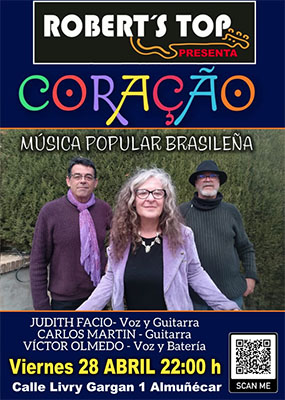ALMUNECAR – Bij bar/restaurant Robert’s Top in Almuñécar staat vrijdagvond 28 april een optreden geprogrammeerd van de Braziliaanse formatie Coração. Het optreden begint rond 22.00 uur.