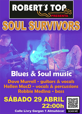 ALMUNECAR – In bar/restaurant Robert’s Top in Almuñécar staat zaterdagavond 29 april een optreden geprogrammeerd van de band Soul Survivors. Het optreden begint rond 22.00 uur.