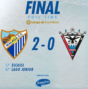 MALAGA – In de Spaanse Segunda División heeft voetbalclub Málaga CF zaterdagavond 13 mei in het eigen La Rosaleda-stadion een knappe 2-0 overwinning geboekt op CD Mirandés. De vrijwel zekere degradant (louter theoretisch bestaat er nog een ontsnappingsroute bij winst in de twee resterende competitiewedstrijden én bij verlies van de naaste concurrenten) klopte de middenmoter in een gelijk opgaande wedstrijd.