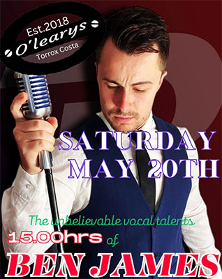 TORROX – De Britse zanger/gitarist Ben James treedt zaterdagmiddag 20 mei op bij O’Leary’s Irish Bar in de kustplaats Torrox. Het optreden begint rond de klok van 15.00 uur.