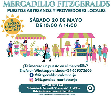 NERJA – Op het terras van Fitzgerald´s Bar naast het park Verano Azul (Calle Antonio Ferrandis Chanquete) wordt deze zaterdag 20 mei een markt gehouden. Het betreft een maandelijkse markt (elke derde zaterdag van de maand) met handgemaakte producten.