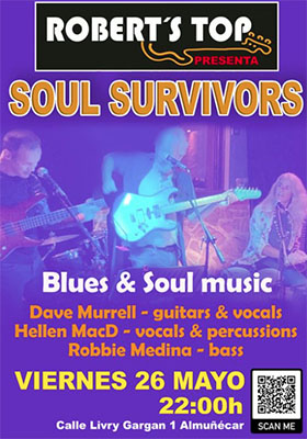 ALMUNECAR – In bar/restaurant Robert’s Top in Almuñécar staat vrijdagavond 26 mei een optreden geprogrammeerd van de band Soul Survivors. Het optreden begint rond 22.00 uur.