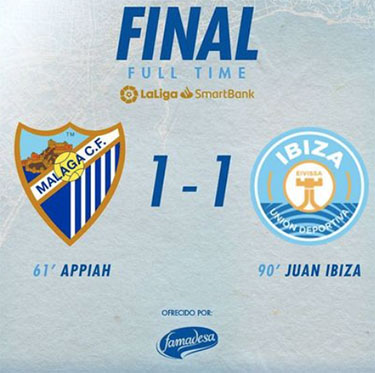 Voor Málaga leek het er lang op dat een desastreus seizoen in ieder geval nog met een overwinning werd afgesloten. Door een treffer van Arvin Appiah in de 61ste minuut stevende de thuisclub lang af op een zege, tot Juan Fernández Blanco daar voor UD Ibiza in de slotminuut anders over besliste. Zijn doelpunt bepaalde de eindstand op 1-1.