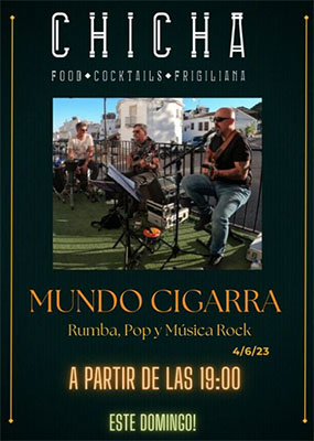 FRIGILIANA – De band Mundo Cigarra treedt zondagavond 4 juni op bij restaurant Chicha aan het Plaza de las Tres Culturas in Frigiliana. De formatie brengt voornamelijk rumba-, pop- en rockmuziek ten gehore.