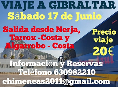 NERJA – De lokale reisvereniging Viajes Verano Azul heeft voor zaterdag 17 juni een dagtrip per bus uitgezet vanuit Nerja naar Gibraltar. De tocht kost 20 euro per persoon, met opstapplaatsen in zowel Nerja (park Verano Azul), Torrox-Costa als Algarrobo-Costa.