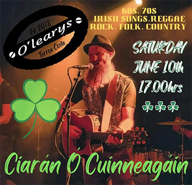 TORROX – De Ierse zanger en gitarist Cíarán Ó´Cuínneagáin verzorgt zaterdagavond 10 juni een akoestisch optreden in de kustplaats Torrox, op circa tien kilometer van Nerja gelegen. Dit gebeurt op het terras van O’Leary’s Irish Bar aan de Paseo Maritímo de Ferrara.