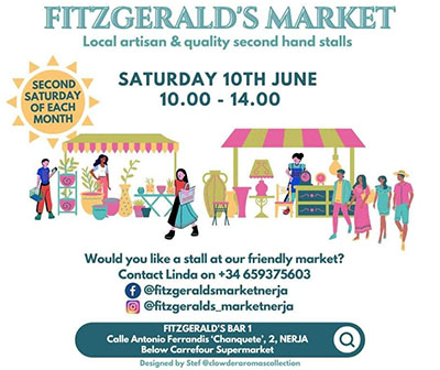NERJA – Op het terras van Fitzgerald´s Bar naast het park Verano Azul (Calle Antonio Ferrandis Chanquete) wordt deze zaterdag 10 juni een markt gehouden. Het betreft een maandelijkse markt met handgemaakte producten.