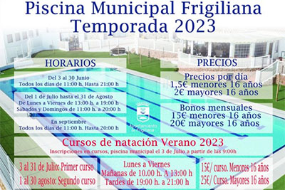 In de maanden juli en augustus zijn de openingstijden voor de doordeweekse dagen vastgesteld op 13.00-19.00 uur, op zaterdagen en zondagen van 11.00-20.00 uur. Voor september gelden dagelijkse openingstijden van 11.00-20.00 uur. Het openlucht zwembad is te vinden aan de Carr. Circunvalacion 31 in Frigiliana.