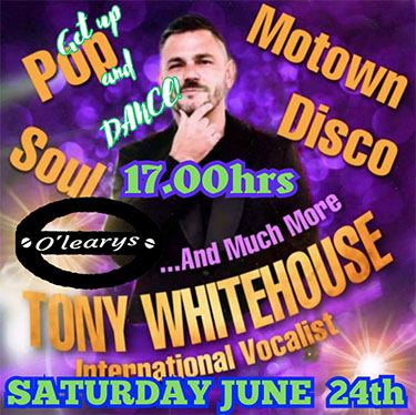 TORROX – De Britse zanger Tony Whitehouse treedt zaterdagavond 24 juni op bij O’Leary’s Irish Bar in de kustplaats Torrox. Het optreden begint rond de klok van 17.00 uur.