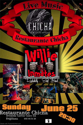 FRIGILIANA – De band Willie & The Inmates treedt zondagavond 25 juni op bij restaurant Chicha aan het Plaza de las Tres Culturas in Frigiliana. De formatie brengt voornamelijk rockabilly-muziek ten gehore.