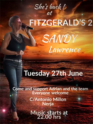 Zangeres Sandy Lawrence treedt op bij Fitzgerald’s Bar II NERJA – De zangeres Sandy Lawrence treedt dinsdagavond 27 juni op bij Fitzgerald’s Bar II aan de Calle Antonio Millón 2 in het centrum van Nerja. Het optreden begint rond de klok van 22.00 uur, de bar is geopend vanaf 19.00 uur. Delen: Klik om te delen op X (Opent in een nieuw venster) X Klik om te delen op Facebook (Opent in een nieuw venster) Facebook Vind-ik-leuk Aan het laden...