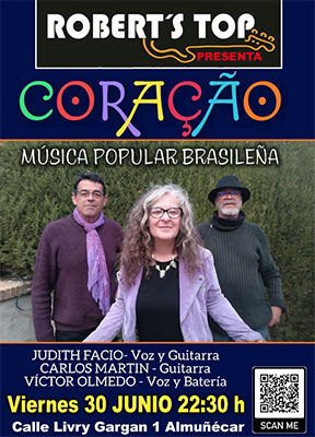 ALMUNECAR – Bij bar/restaurant Robert’s Top in Almuñécar staat vrijdagavond 30 juni een optreden geprogrammeerd van de Braziliaanse formatie Coração. Het optreden begint rond 22.30 uur.